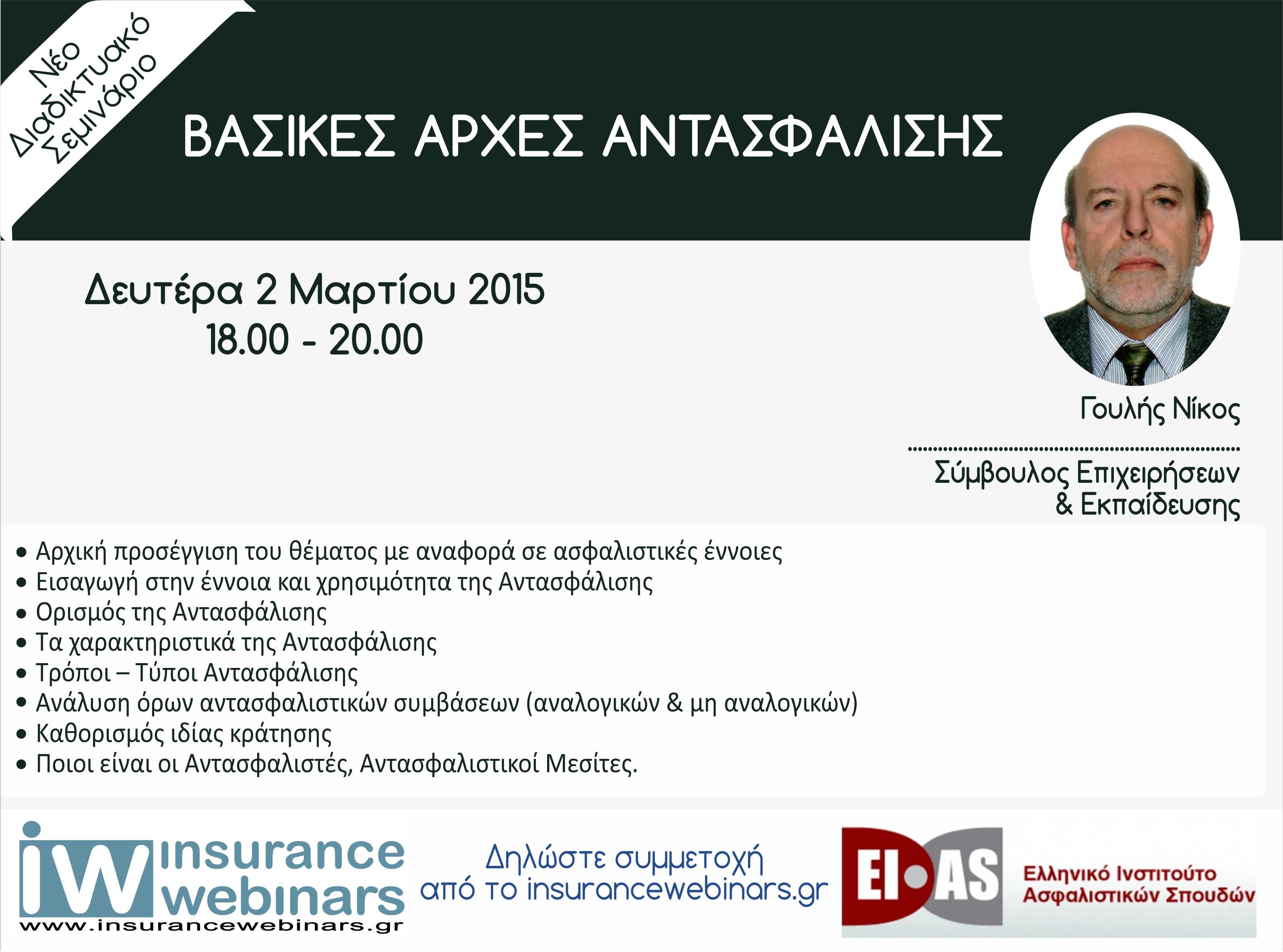 Η πληρέστερη κατανόηση των εννοιών και της χρησιμότητας της Αντασφάλισης, η ανάδειξη των σημαντικών σημείων της θεματολογίας και της λειτουργίας των βασικών μηχανισμών της είναι ο σκοπός του webinar που διοργανώνουν το ΕΙΑΣ και το insurancewebinar.gr.
