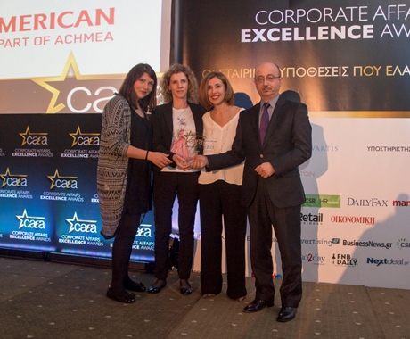 Στη φωτ. τα στελέχη της διεύθυνσης Δημοσίων Σχέσεων & ΕΚΕ της Interamerican Γιάννης Ρούντος (διευθυντής), Χρύσα Ελευθερίου (προϊσταμένη) και Βίβιαν Αραβανή με τη Δήμητρα Δασκαλάκη, πρόεδρο της οργανωτικής επιτροπής των Corporate Affairs Excellence Awards, κατά την επίδοση του βραβείου.