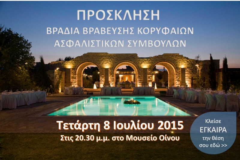 Την Τετάρτη 8 Ιουλίου 2015, στις 20:30 μ.μ. στο Μουσείο Οίνου, θα πραγματοποιηθεί η καθιερωμένη ετήσια εκδήλωση του ΠΣΑΣ, για την Βράβευση των κορυφαίων Ασφαλιστικών Συμβούλων της Χώρας, για το έτος 2014.