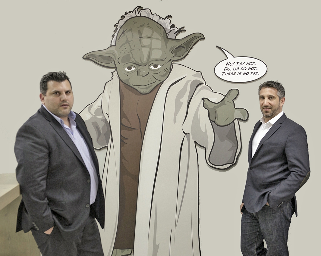 Στους τοίχους ο Γιόντα, σοβαρός, να δηλώνει: «No! Try not. Do, or do not. There is no try» και πιο κάτω σούπερ-ήρωες σε σούπερ διαστάσεις και εγώ να σκέφτομαι ότι ο 5χρονος ανιψιός μου σίγουρα θα ενθουσιαζόταν να βρεθεί εδώ! Κι όμως, δεν πρόκειται για ένα παιδικό ή εφηβικό δωμάτιο, αλλά για τα γραφεία του insurancemarket.gr και εμείς βρεθήκαμε εδώ για μια συνέντευξη με τους επικεφαλής του, κ.κ. Μανώλη Μαρσέλλο και Σωτήρη Παπαντωνόπουλο.