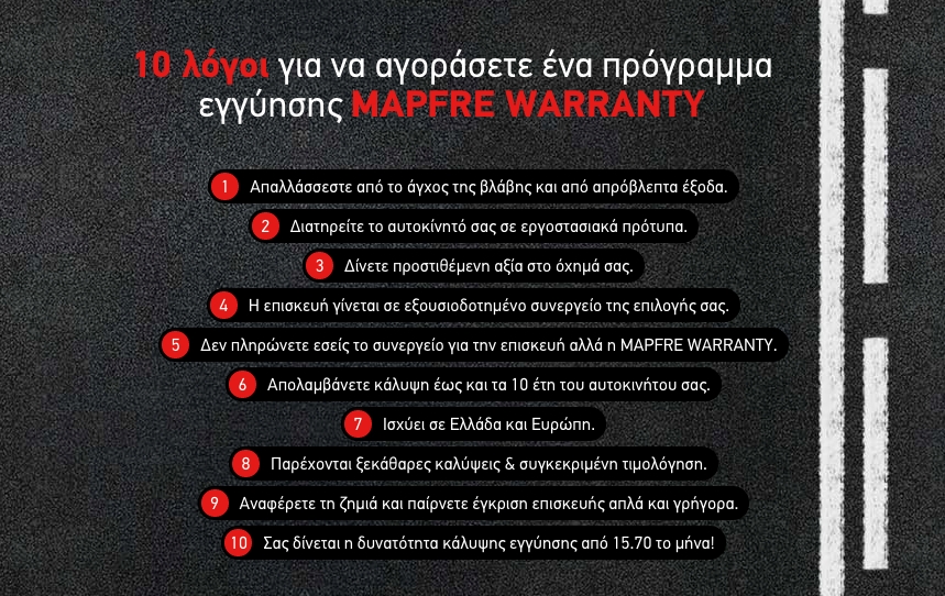 Η διαδικασία αγοράς ενός προγράμματος εγγύησης αυτοκινήτου είναι απλή, καθώς οι ενδιαφερόμενοι μπορούν, είτε μέσω του mapfrewarranty.gr, είτε καλώντας στο 210 6504050, να ασφαλίσουν απευθείας το όχημά τους από μηχανικές, ηλεκτρολογικές ή ηλεκτρονικές βλάβες.