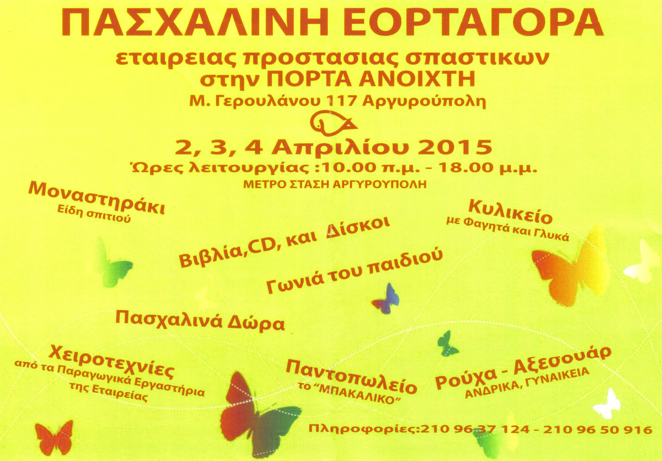 Πασχαλινή εορταγορά διοργανώνει η Εταιρεία Προστασίας Σπαστικών στην ΠΟΡΤΑ ΑΝΟΙΧΤΗ, στις 2, 3 και 4 Απριλίου 2015, από τις 10:00 π.μ. έως τις 18:00 μ.μ.