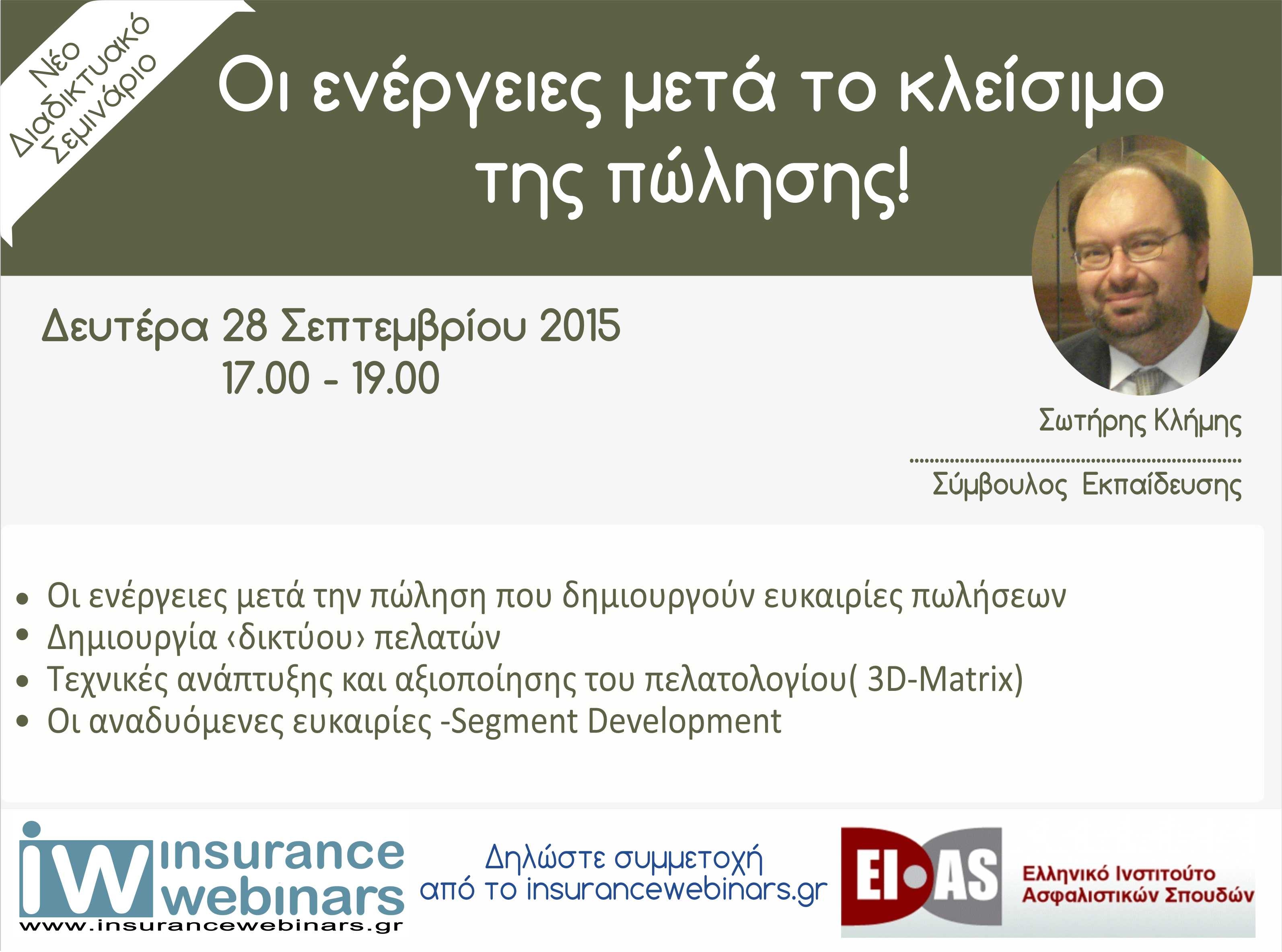 Webinar με τίτλο «Οι ενέργειες μετά το κλείσιμο της πώλησης» και εισηγητή τον Δρ. Σωτήρη Κ. Κλήμη, Σύμβουλο Εκπαίδευση, διοργανώνουν το ΕΙΑΣ και το insurancewebinar.gr, τη Δευτέρα 28 Σεπτεμβρίου 2015, ώρα: 17:00 – 19:00.